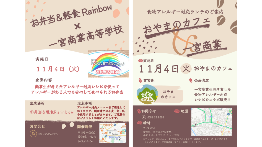10月21日(火)の総合的な探究の時間に一宮市のお弁当&軽食Rainbow様・おやまのカフェ様・一宮市アレルギっ子サークルくれよん様・株式会社アイ・シー・シー様が来校されました。