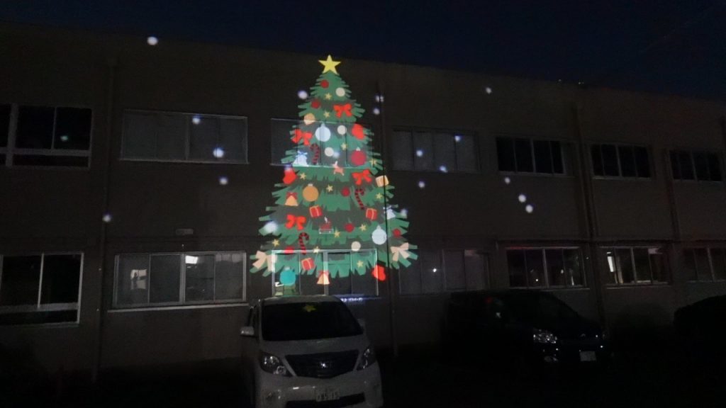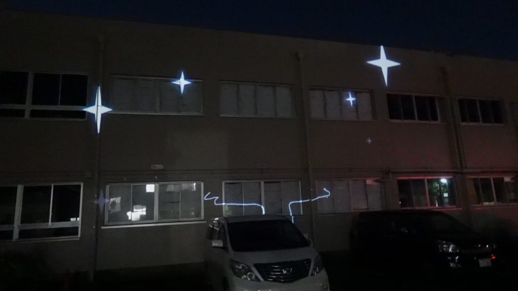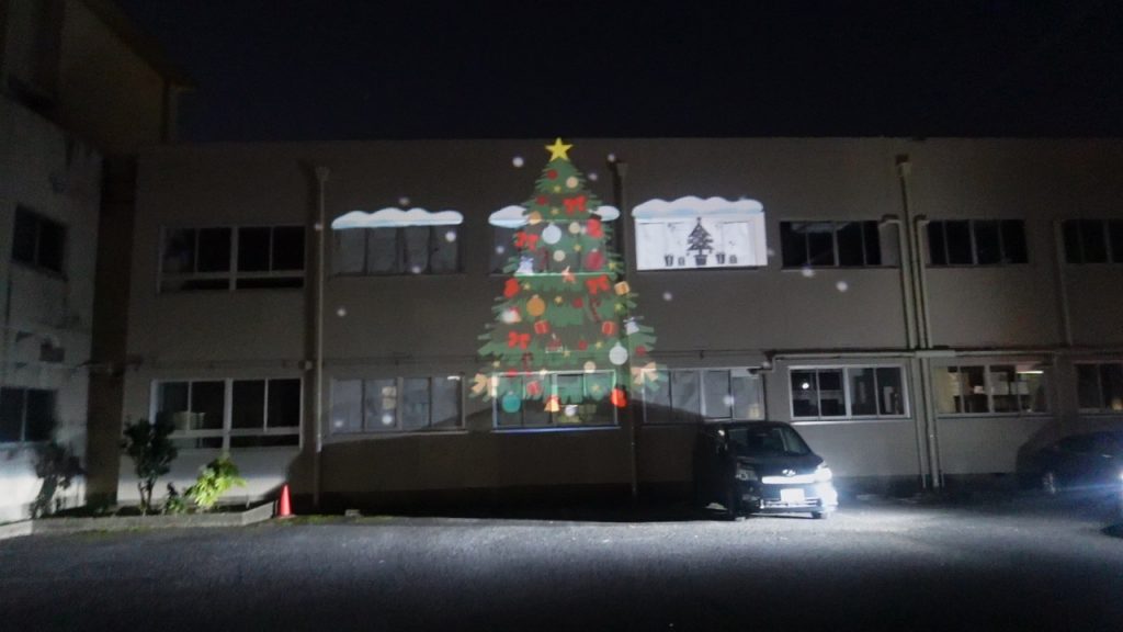 今回は校舎を投影対象にして、窓ガラスの位置を活用したクリスマスをテーマにした作品でした。