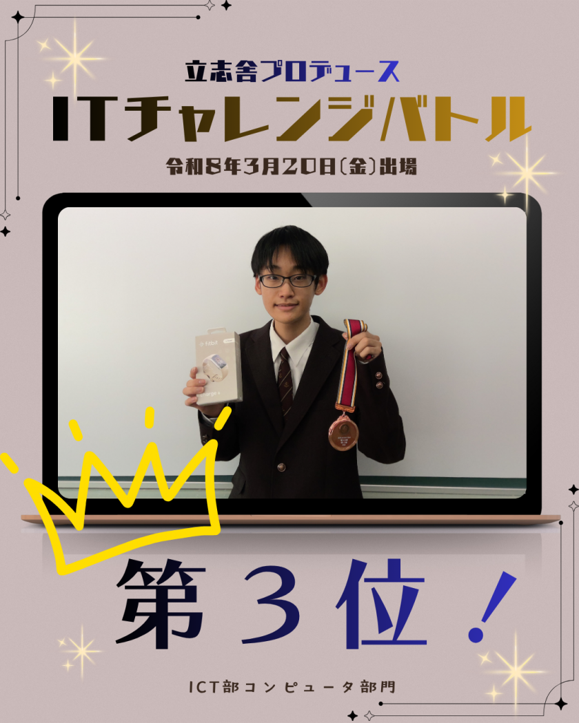 立志舎さんがプロデュースする、「ITチャレンジバトル」で2年生の北川くんが全国で第3位に入賞しました。